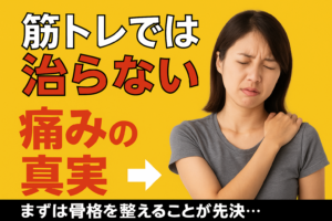 身体の土台である骨格が歪んだまま筋トレや運動をすると、ズレた骨格に合わせて筋肉がついてしまい、かえって痛みが固定されてしまうのです。