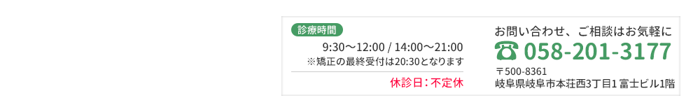| 診療時間 | 9:30~12:00 / 14:00~21:00 ※矯正の最終受付は20:30となります |